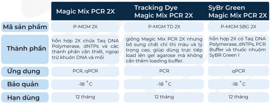- Nồng độ 2X của Taq DNA Polymerase, dNTPs, PCR Buffer và thuốc nhuộm SyBR Green.